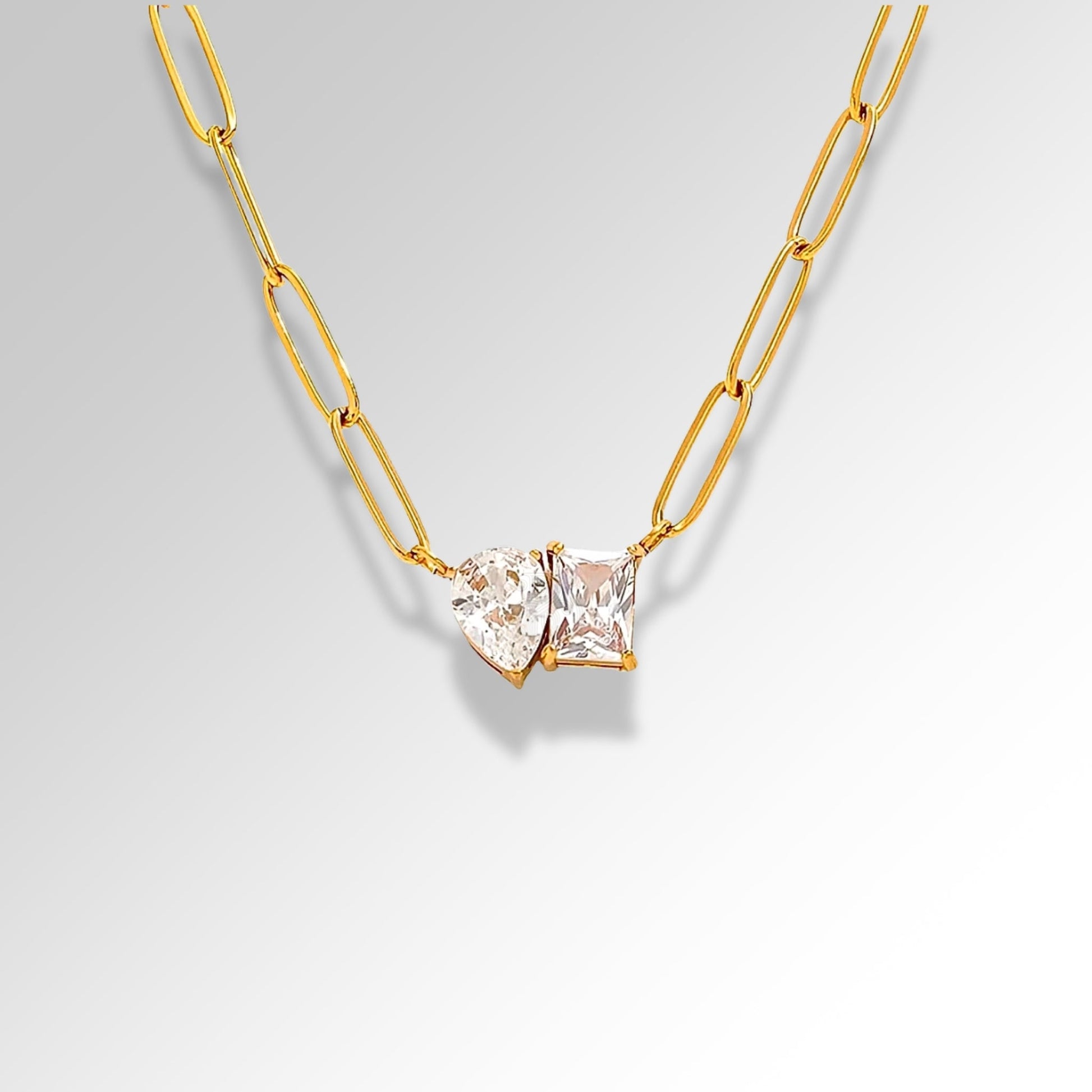 The Radiant Duo Necklace blends sophistication and durability in a striking, modern design. Featuring a unique parachute-shaped gemstone paired with a square-cut gemstone, this necklace is a perfect harmony of elegance and contemporary flair.