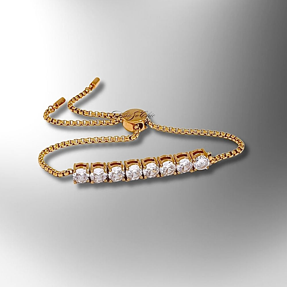 The Eight Luxe Slider is designed to turn heads without saying a word. Made from durable, high-quality stainless steel and set with eight 5mm cubic zirconia stones in a secure claw setting, this bracelet delivers just the right touch of sparkle. The sleek 40mm stone bar glides across a 10-inch chain, finished with a smooth slider clasp that adjusts for your perfect fit—no fuss, just polished shine.