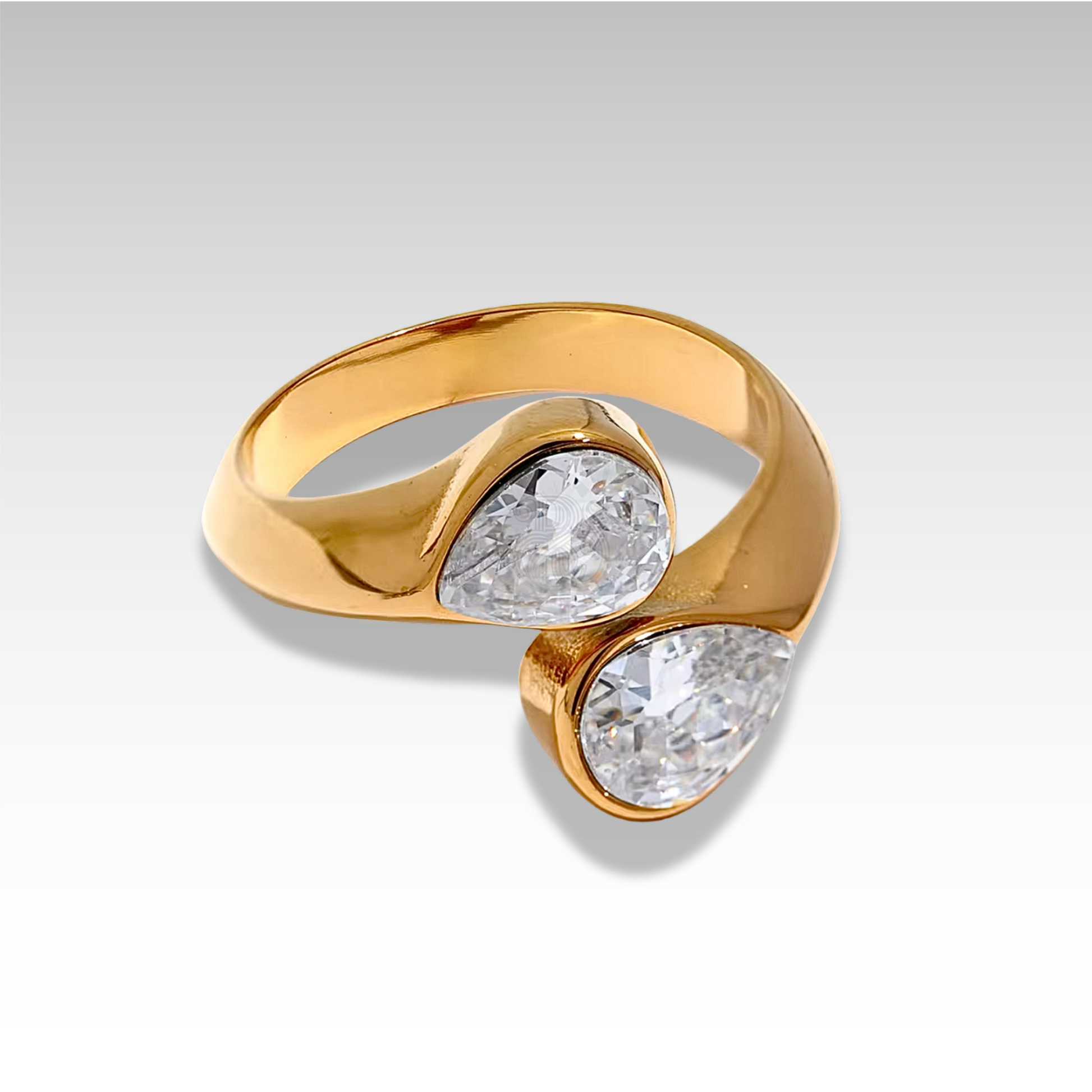 A perfect harmony of brilliance and fluidity, The Twin Flame Ring symbolizes connection and elegance. Designed with an adjustable high-quality stainless steel band, plated in real gold or silver, this sculpted piece gracefully wraps around the finger, embracing two teardrop-cut cubic zirconia stones for a radiant finish.